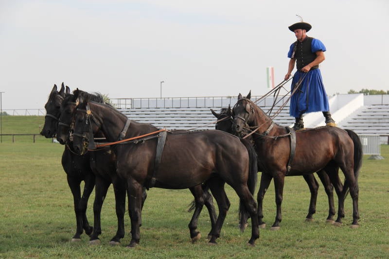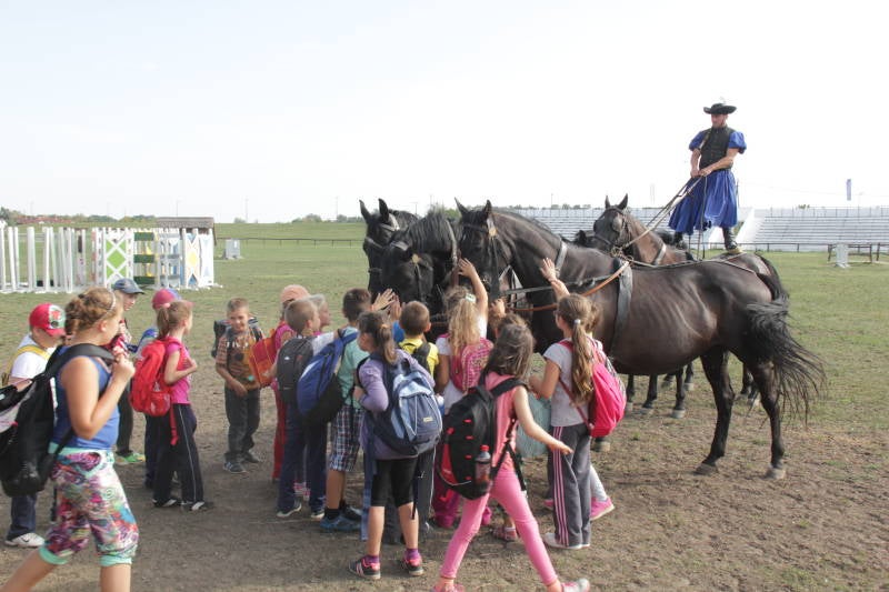 Even boodschappen halen op de scooter. Om 2 uur stappen we op de paard en wagen en rijden de poesta in. We zien buffels en koeien met grote horens. Een paar Hongaarse boeren in blauwe gewaden doen een paar trucs met hun paarden. We mogen ook op de paarden rijden. 's Avonds is er een mooie zonsondergang.