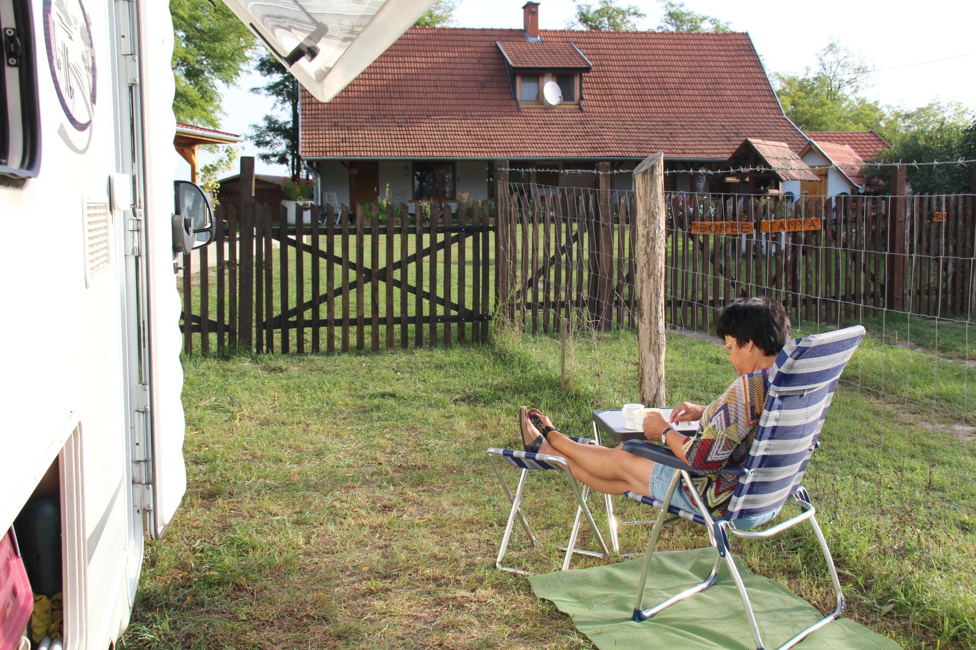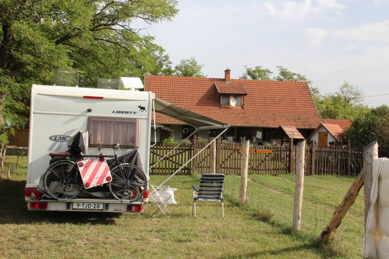 Het waait behoorlijk. We rijden over de snelweg naar Hongarije. Bij de grens koffie gedronken. Daarna over hobbelige binnenwegen langs de grens naar Eger gereden. Op de camping vol met een Franse reisgroep rijd ik achteruit in een greppel. De camper zit vast. Met behulp van de camper van Ab worden we er weer uit getrokken. Een Franse man help ons met een antislipmat. 's Avonds barbecueën we. Een Fransman laat ons zijn roadboek lezen van hun reis.