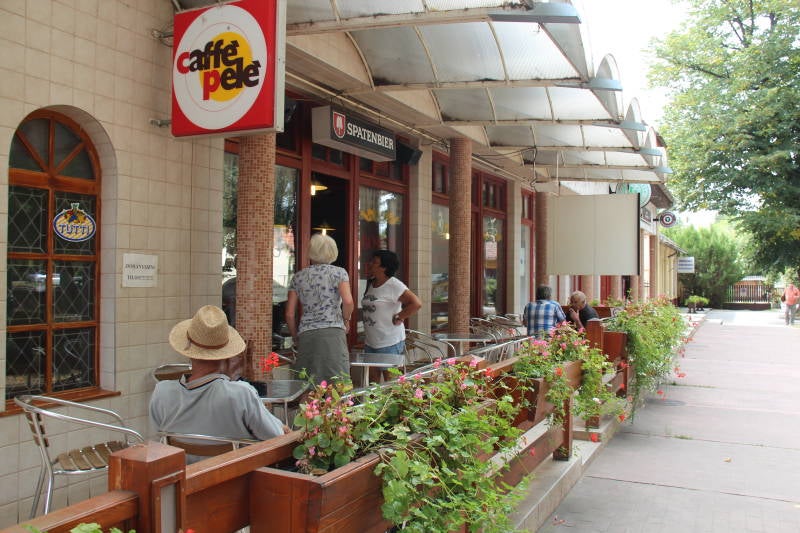 Eindelijk de zon. Meteen wasje gedaan en lekker in de zon buiten gezeten. Daarna op de fiets langs de rivier naar Piešťany gereden. Geflaneerd door de hoofdstraat. Het is lekker weer en er lopen heel wat mensen rond. Er is ook een groepje dat op het gras wat staat te zingen. Waarschijnlijk moeten ze straks in de kerk een huwelijk begeleiden. We doen gelijk wat boodschappen en nemen een wijntje en een biertje op een terras.