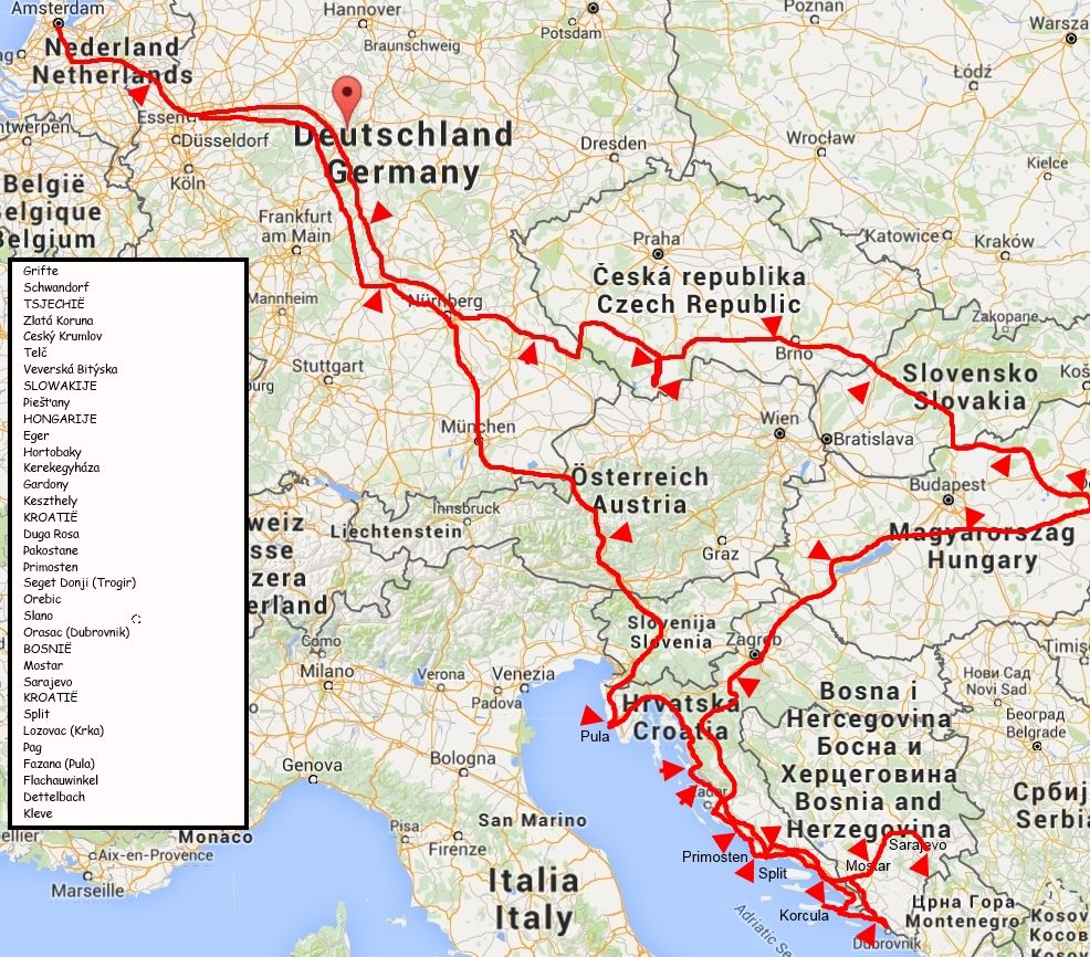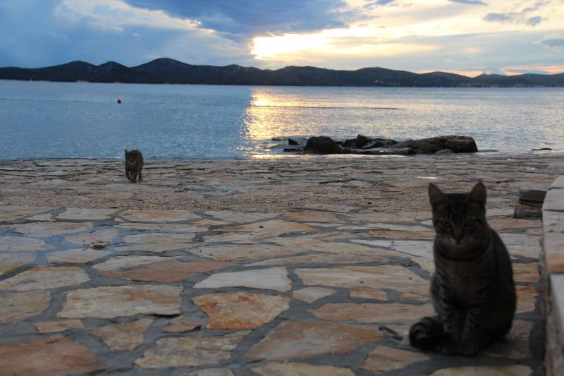 Hele dag regent het. We rijden over de 23 naar Zadar. Daarna via snelweg A1 richting Split. Bij Zadar gaan we naar de kustweg. De eerste camping bij Pakoštane is niks. Dan maar de andere van 350 plaatsen. Dicht bij het water zijn kleine plekken. We vinden wat ruimere plekken verderop. Jip is ook weer tevreden. Zijn wilde vrienden wachten hem al bij het water op.
