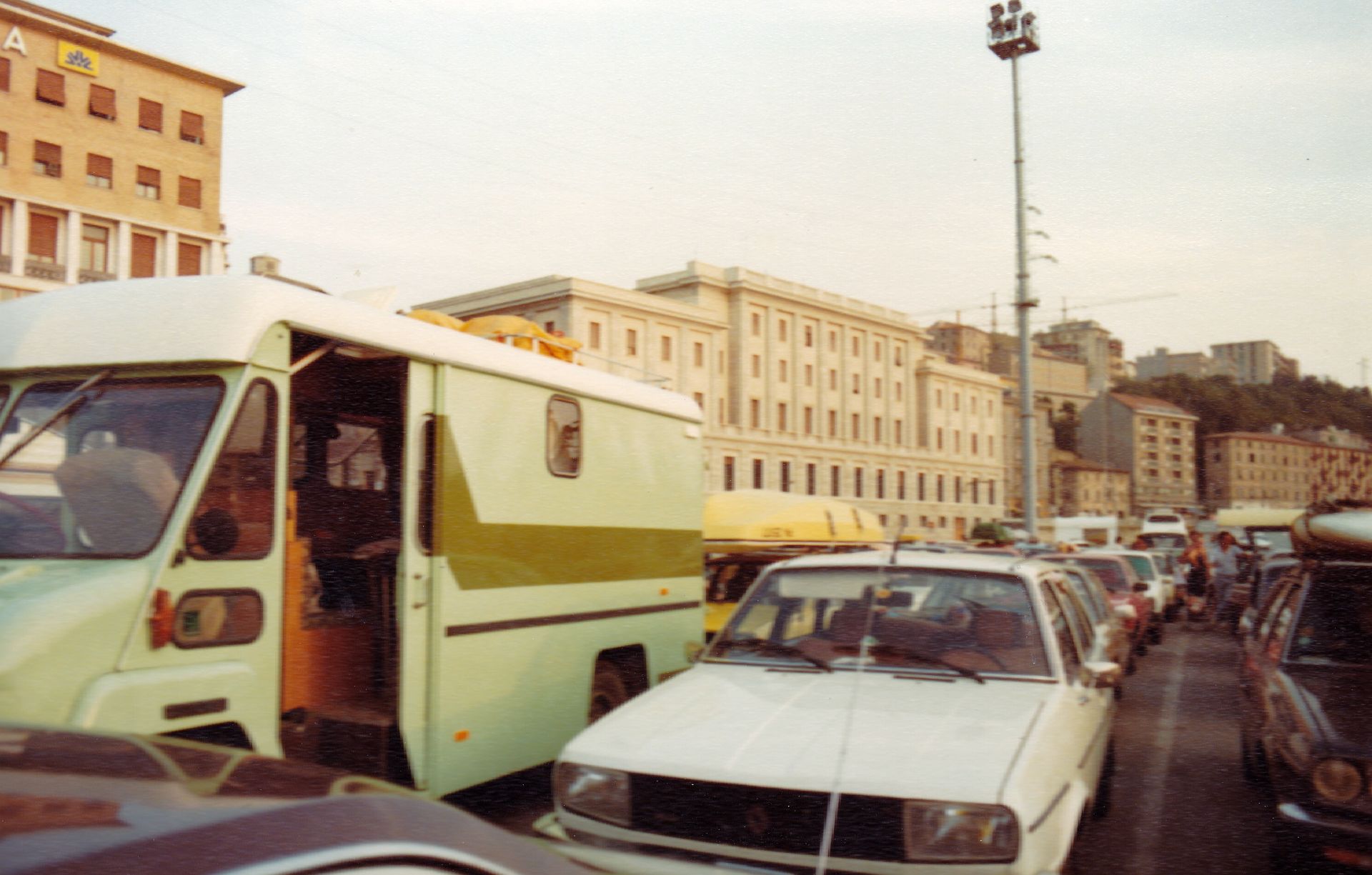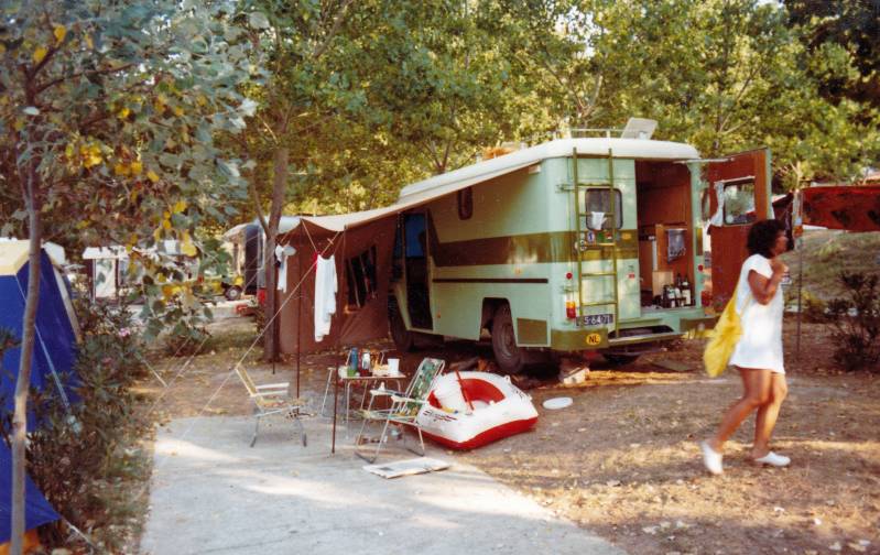 Na alles geleegd en gevuld te hebben vertrekken we om 9.15. Het is koud en mistig, maar gelukkig droog. Bij de receptie komen we er achter dat een kennis van ons deze camping van de winter heeft geboekt. Er was nog plaats genoeg als we in september boeken. We nemen eerst de Fernpas. Geen problemen voor de Commer. Op weg naar de Brenner zien we een Belg die een R4 heeft omgebouwd als hondenwagen. De namen stonden er op , Lady en Ciska. Duidelijk een dierenvriend. Op de Brenner begon de Commer toch weer kuren te krijgen. Maar we waren niet de enigen met een warme motor. Het probleem is dat de weg te lang achter elkaar stijgt. De motor krijgt dan te weinig rijwind. Samen vinden we een goede oplossing. Een blok hout klemmen we onder de motorkap. Die blijft dan op een kier staan en geeft meer verkoeling. We binden de motorkap voor de zekerheid met een touwtje vast. Het blijkt prima te werken. Over de autostrada rijden we langs het Gardameer tot Mantova. Daar kiezen we de binnenweg. Het wordt steeds warmer 35 graden, maar met open deuren hebben we er weinig last van. Langs de weg staat een meloenenverkoper. We stoppen. De vrouw zegt een prijs, maar de man komt er tussen en zegt een hogere prijs. Ons Italiaans is niet goed genoeg om deze actie tegen te gaan. We eten de meloen half op en rijden door naar de kust. In Ferrara hadden we pech. Stoplicht ging op rood. We konden niet op tijd stoppen. Reden een metertje naar achteren en jawel tegen de auto van een Italiaan aan. Mistlamp kapot, kwaaie Italianen. Gelukkig kwam er een agent aan. Hij regelde alles en waarschuwde ons voor de andere partij die er een voordeeltje uit wilde slepen. Zijn portieren gingen opeens niet meer dicht. De agent moest lachen toen hij zag dat wij niets hadden. Prima auto. We moesten de remproef doen, geen probleem natuurlijk. We kregen de adres van de agent voor het geval dat we dat nodig hadden. Er zijn ook goede Italianen. Daarna reden we door naar Rimini. We werden moe dus op zoek naar een camping. Aan de kust geen campings. Het leek wel Zandvoort en Egmond in het kwadraat. Horden