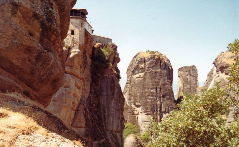 Om 9 uur vertrokken we. Moeders bleef nog even liggen en Ed en Annet volgden de goede route. We rijden van Trikala naar Meteora. Daar hebben ze kloosters op hoge rotsen. We bezoeken de kloosters in lange broeken en met jasjes aan. Annet had toch een te bloot jurkje aan. Enfin jas aan en door lopen maar. We bekijken een nonnenklooster en een mannenklooster. Heel apart. Vroeger werden de kloosters bevoorraad met een netje. Nu is er een weg naar iedere klooster, voornamelijk voor de toeristen natuurlijk. We zagen een groepje nonnen die bezig waren met het uitzoeken van boontjess. We doen later inkopen en rijden naar de kust. Op de snelweg rijd je tussen vrachtwagens en boeren met paard en wagen. Met veel moeite vinden we een camping. Camping Stolos is niet zo geweldig. Onze overbuurman handelt in T-shirts vanuit zijn kofferbak. Er wordt gepast en onderhandeld. Voor de camping worden we overvallen door een aantal vrouwen die ons van alles willen aansmeren. Overigens waren ze erg vriendelijk. ’s Avonds gebarbecued met de gekregen kruiden van de Griekse boer. Wel lekker.