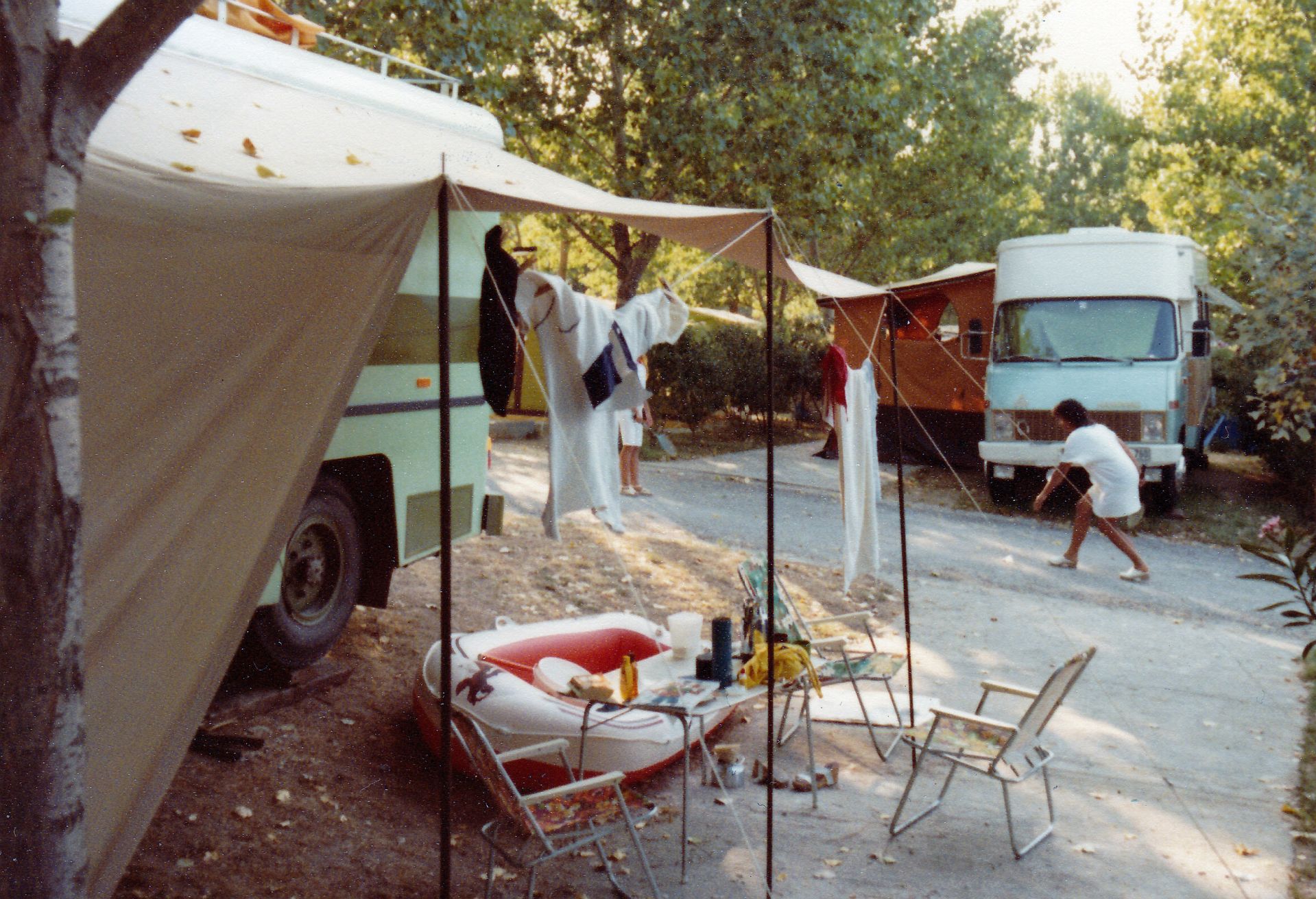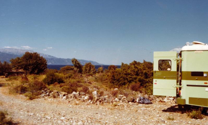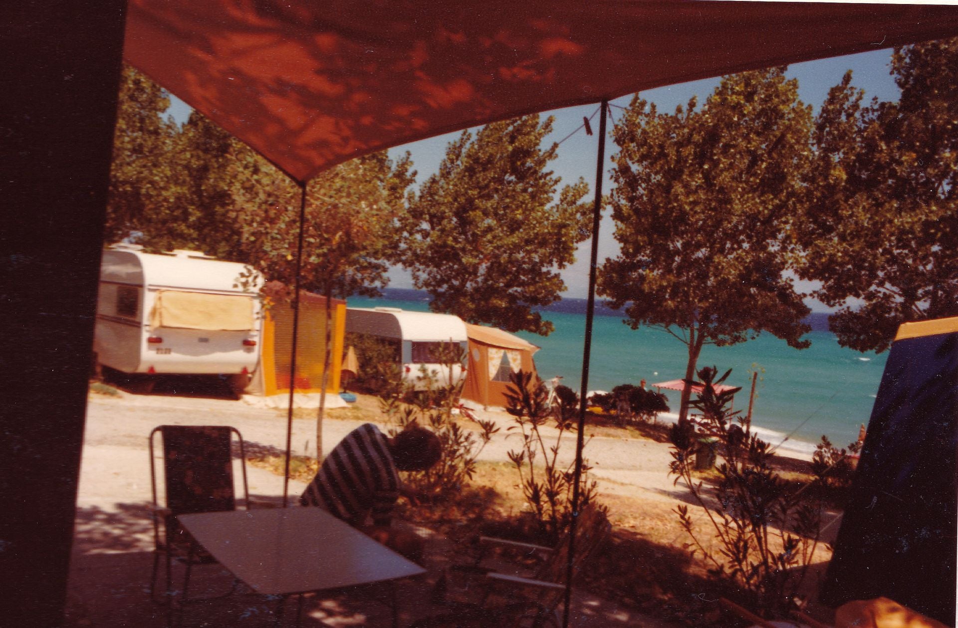 Heerlijk gezwommen aan het strand dat langs de camping ligt. ’s Avonds zijn we uit eten gegaan. Souvlaki voor fl 10,- de man inclusief fles wijn en cola. De Commer staat zo scheef dat de koelkast het niet meer doet. We hebben van alles geprobeerd , maar het helpt niet. Morgen proberen met de krik de auto wat recht te krijgen. Grieken zijn rare kampeerders. Ze nemen een complete koelkast mee voor naast de tent. Boven op de koelkast zetten ze hun tv die de hele avond luid het programma af draait.