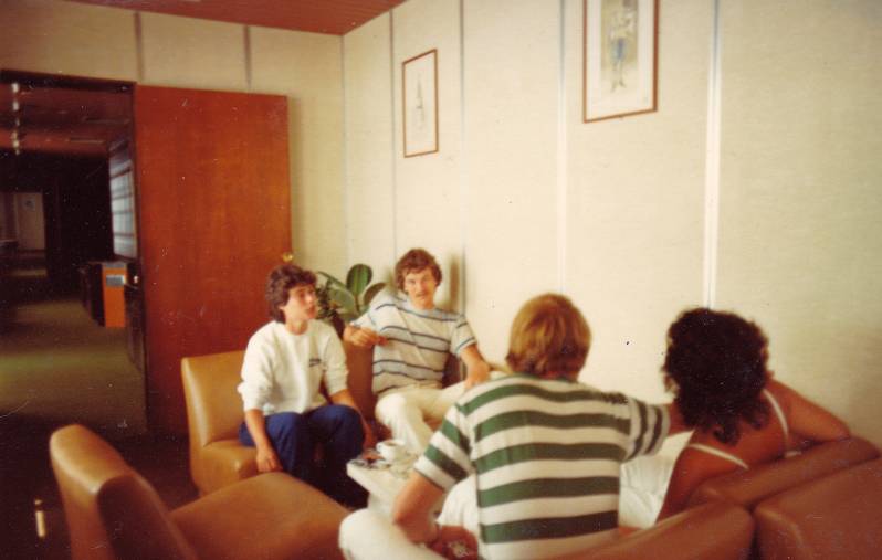We stonden te laat op voor het ontbijt. De klok was een uur vooruit gezet en dat waren we vergeten. We waren niet de enigen, want de tosti meneer bij de bar kreeg het zo druk dat hij er geen gat meer in zag. Na een kop koffie gingen we zonnen op het dek. Annet dook in een van de drie zwembaden. ’s Middags gingen we klaverjassen en ’s avonds wilden we met zijn vijfen eten in het restaurant. Maar helaas om 8 uur was alles vol. Als je wilde eten moest je eerst bonnen kopen. Zeer onlogisch allemaal. ’s Avonds was er een disco. Annet had sjans van een Amerikaans jochie. Om half 2 waren we in Corfu. De boot zou 1 uur stil liggen, maar dat liep natuurlijk weer uit de hand. Er bleek 1 auto vast te staan die er toch wel uit moest. De auto kan niet weg. Er stond een auto voor, maar die mensen lagen al in bed. Intussen was het half 3. Oma was het zat en ging op een stoel zitten midden op de kade.(zie foto hierboven) Om 3 uur was het gepiept en kon de boot vertrekken. We zijn toen maar naar bed gegaan.