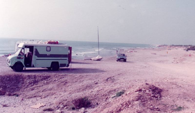 Helaas blijkt ’s morgens het strandje zo vervuild dat we worden weg gejaagd door horden vliegen. We stappen maar op en rijden een heel eind door. ’s Middags zoeken we een strandje op bij Aquilas. We zwemmen en snorkelen lekker rond. Daarna vinden we een nieuwe manier van douchen. Ed neem een jerrycan met water naar het dak en stort het uit over ons. Zo kunnen we ons haar wassen en douchen. We kopen wat in voor de barbecue en rijden weer door. Achter ons halen twee auto’s elkaar in terwijl een vrachtwagen af slaat. Dus alle drie op elkaar. Gelukkig alleen blikschade. Later steekt een jongen vlak voor ons over zonder uit te kijken. We kunnen hem nog net ontwijken door hard te remmen. In het donker stoppen we bij Los Alcazares langs een binnenzee. We barbecueën en gaan daarna naar bed. Midden in de nacht komen vrachtwagens aan rijden. Ze parkeren naast ons. ’s Ochtends doen ze een deel van hun achterkant open en ik zie een kompleet bakstel in de bak staan. Ja , zo kan je ook kamperen.