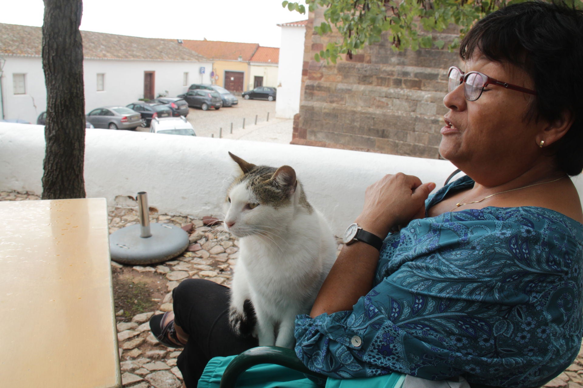 Woensdag 15 oktober naar Silves Het zonnetje meldt zich weer met af en toe een drupje regen. Op de scooter gaan we naar Silves. We rijden dwars door de steile heuvels. De afstand is groter dan we dachten en onze benzine raakt op. Net op tijd bereiken we de stad en het benzinestation. Er is een mooi Moors kasteel ( Castello dosMouros). We bezoeken het kasteel en drinken een kopje koffie op een mooi terras. Een lieve poes komt onze schoot zitten. Over de snelweg rijden we de 60 km weer terug.